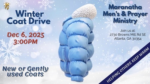 Our Men's & Prayer Ministries are sponsoring a coat drive for the community. If you have any new or gently used coats, please bring them by Dec 6th.