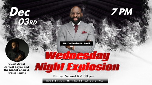 Our next Wednesday Night Explosion will be on Wed, Dec 3, 2025. Our guest speaker is the dynamic Pastor Debleaire Snell. Dinner @ 6pm, Service @ 7pm.