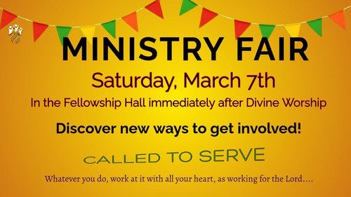 Join us for our Ministry Fair on Saturday, March 7th, immediately after church. Discover your gifts, meet ministry leaders, and find your place to serve!